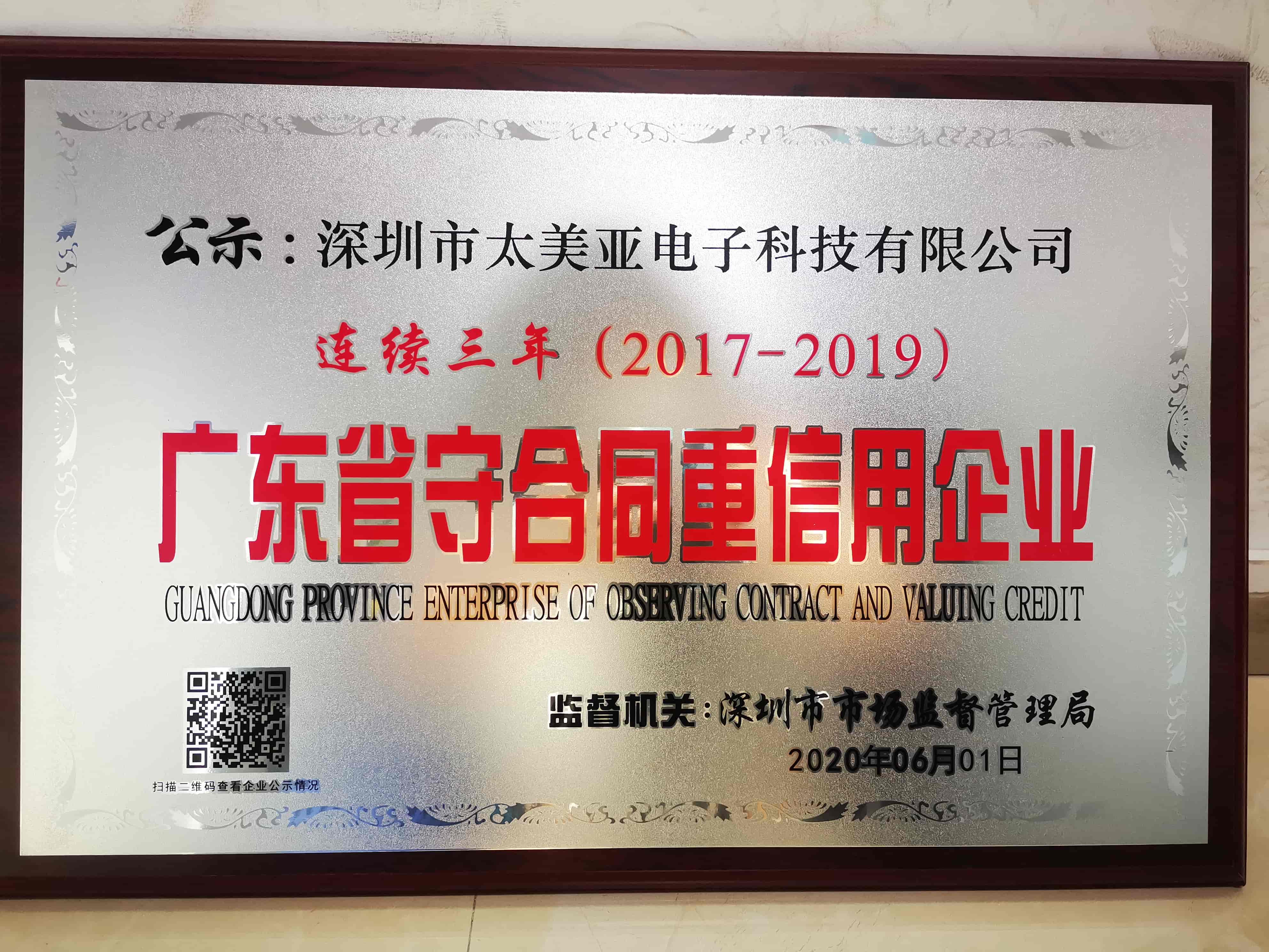 Recently, the results of the 2019 "Guangdong Province Abiding by Contracts and Valuing Credit Enterprises" selection results have been released. Shenzhen Timeya Electronic Technology Co., Ltd. has been awarded the honorary title of "Guangdong Province Contract-abiding and Credit-Respecting Enterprises" awarded by the Guangdong Provincial Administration for Industry and Commerce for three consecutive years.